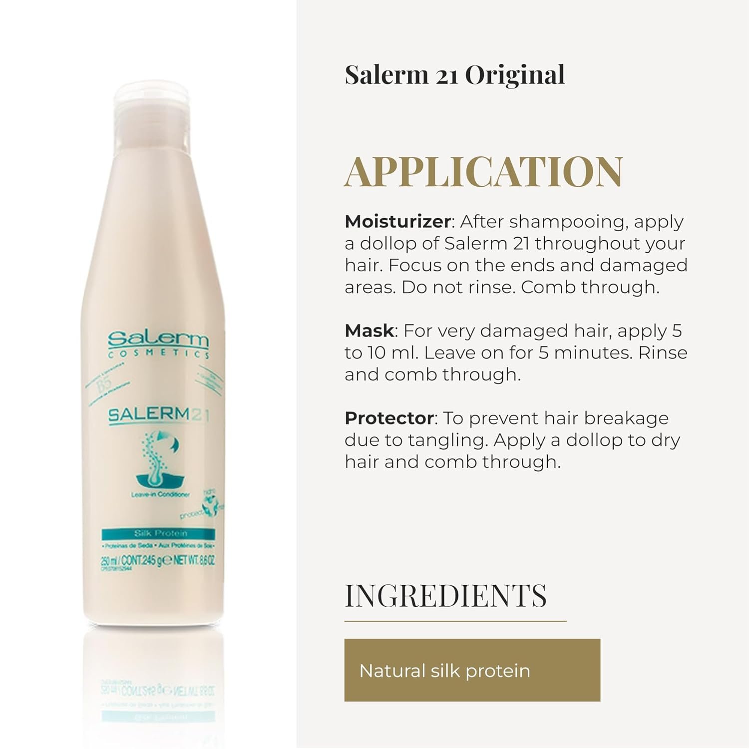 La proteína de seda Salerm 21 actúa como una mascarilla y acondicionador sin enjuague que ayuda a hidratar y desenredar el cabello. Además, su fórmula enriquecida con proteínas de seda, trabaja para mejorar la apariencia general del cabello.